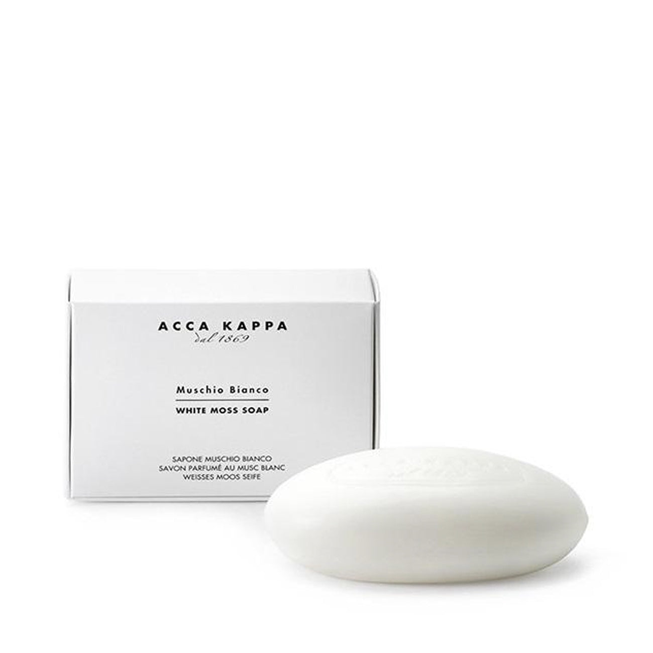 Acca Kappa's intense yet delicate White Moss fragrance is infused into this 150gm natural soap, a renewing blend of citrus, Mediterranean juniper, scented wood, precious lavender and balsamic berries.