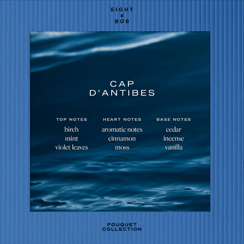 Sophisticated and bursting with vitality, Cap d'Antibes opens with refreshing top notes of mint, violet leaves and birch, intensified with aromatic notes, moss and sweet cinnamon in the heart. Finally, lingering notes of cedar intertwine with smooth nuances of incense and vanilla.